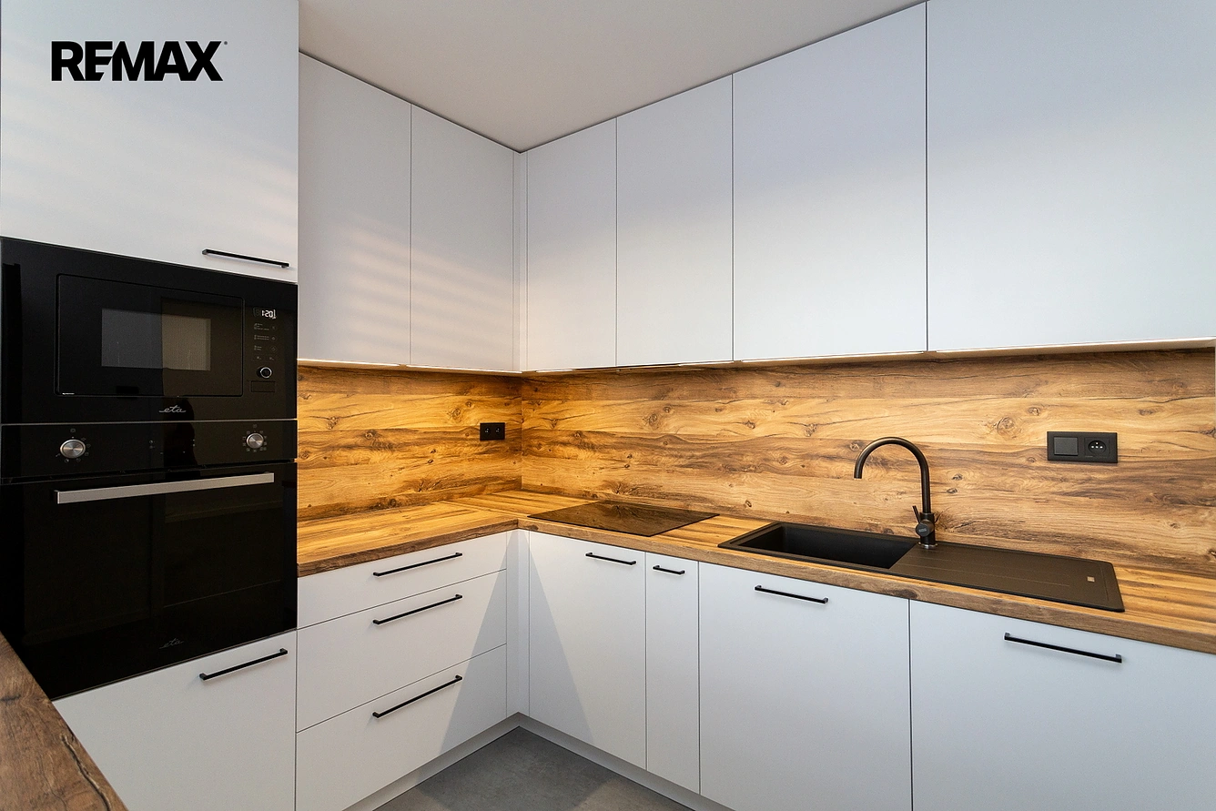 Dispozice: Samostatná kuchyně s pultem se spotřebiči ETA, lednice s mrazákem, myčka, indukční varná deska, elektrická trouba, obývací pokoj, ložnice se vstupem na lodžii a výhledem do zeleně, dětský pokoj / pracovna, koupelna s vanou, samostatná toaleta s pračkou a sušičkou BEKO, dva samostatné sklepy.